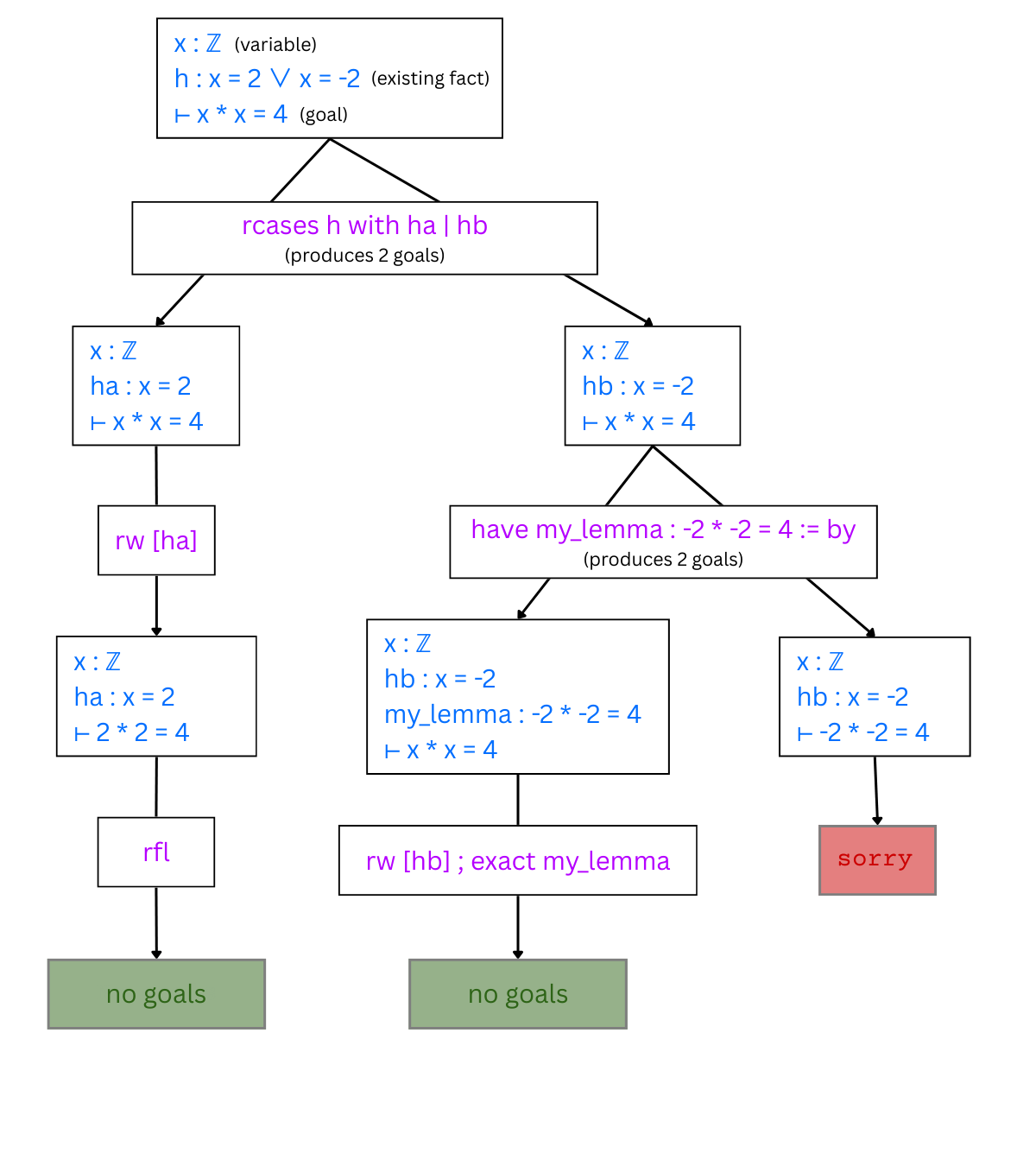 At a high level, the proof consists of tactics, such as rfl, exact, rcases, etc., each of which represents a logical “step” in the proof. At each point between tactics in a Lean proof, there is a proof state, which consists of the available variables and any already-proven facts, along with the goals, which contain what still needs to be proved. Each tactic modifies the current set of goals, producing zero or more subgoals. If no subgoals are produced, that branch of the proof is complete. Tactics may take arguments, and can be nested, as shown above.