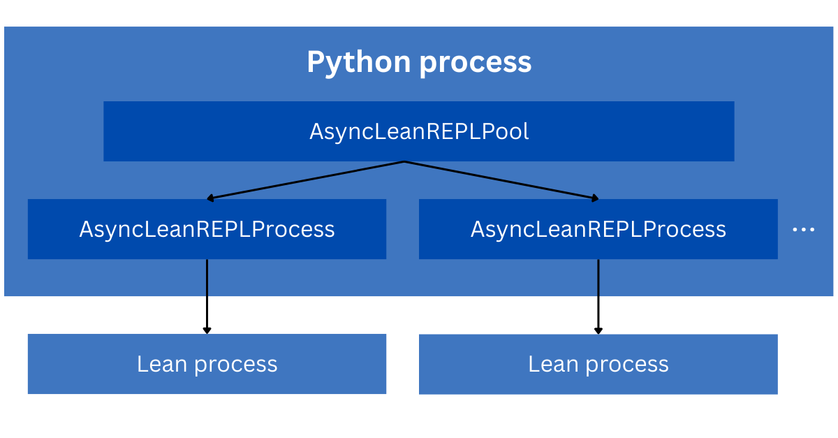 To run multiple REPL processes in parallel, we also created AsyncLeanREPLPool. This class presents the same interface as AsyncLeanREPLProcess, but internally delegates to a dynamically-sized pool of AsyncLeanREPLProcesses. This diagram summarizes the objects’ relationships: