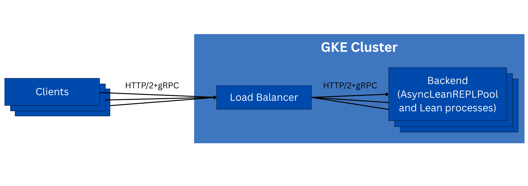 Our first attempt at building this service was fairly simple. We set up a Google Kubernetes Engine cluster using preemptible instances and set up an application load balancer to route connections to backends. We then wrapped AsyncLeanREPLProcess in a simple FastAPI service that has a single WebSocket endpoint, over which multiple queries and responses may be sent. This architecture allows us to scale beyond one machine, but is more complex: