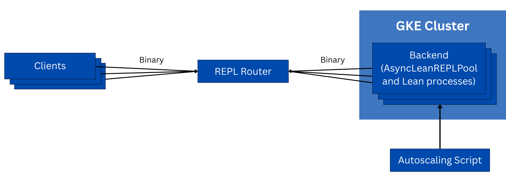 Our first attempt at building this service was fairly simple. We set up a Google Kubernetes Engine cluster using preemptible instances and set up an application load balancer to route connections to backends. We then wrapped AsyncLeanREPLProcess in a simple FastAPI service that has a single WebSocket endpoint, over which multiple queries and responses may be sent. This architecture allows us to scale beyond one machine, but is more complex: